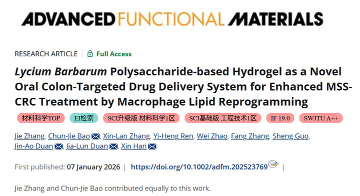 日前,团队在国际权威期刊《先进功能材料》(Advanced Functional Materials,中科院一区,IF:19.0)在线发表研究成果,并获《中国中医药报》报道。研究创新性地以枸杞子多糖为生物活性基质,构建了一种口服结肠靶向水凝胶递药系统,实现化疗药物奥沙利铂在结肠部位的可控缓释,在增强肿瘤组织药物富集的同时,减少药物全身循环,从而显著降低毒副作用。机制研究表明,枸杞子多糖可通过调控肿瘤相关巨噬细胞的脂质代谢,重塑免疫抑制性微环境,提升化疗敏感性。这一工作为开发兼具生物学功能与递药能力的新型生物材料提供了新范式,也为结直肠癌化疗的增效减毒开辟了高转化潜力的新路径。