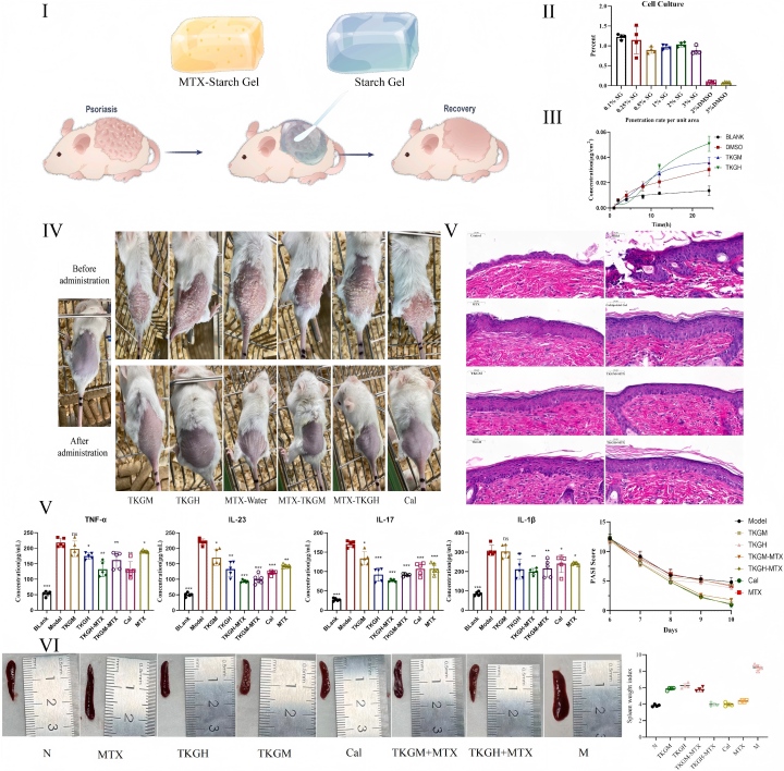 图五、MTX-淀粉凝胶在银屑病治疗中的应用;I银屑病治疗示意图;II-III 凝胶相关性能评价;IV-VI银屑病小鼠模型治疗效果。