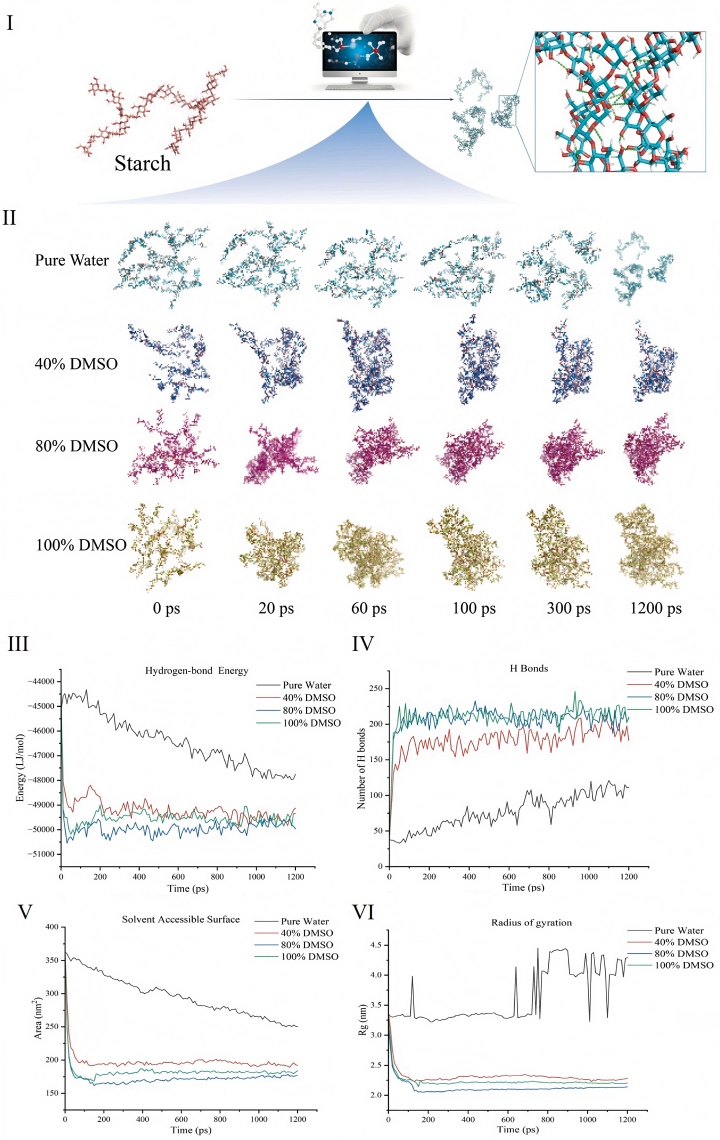 图一、分子动力学模拟揭示淀粉凝胶形成机制;I淀粉链分子动力学模拟示意图;II-VI不同DMSO/水条件下淀粉链的自组装行为及组装过程评价。