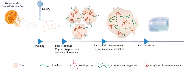 (1)方法创新:利用超声辅助DMSO溶剂法,实现了淀粉凝胶的一步快速制备,制备时间仅需10分钟,避免了传统方法中高温、长时间反生或化学交联等复杂步骤。