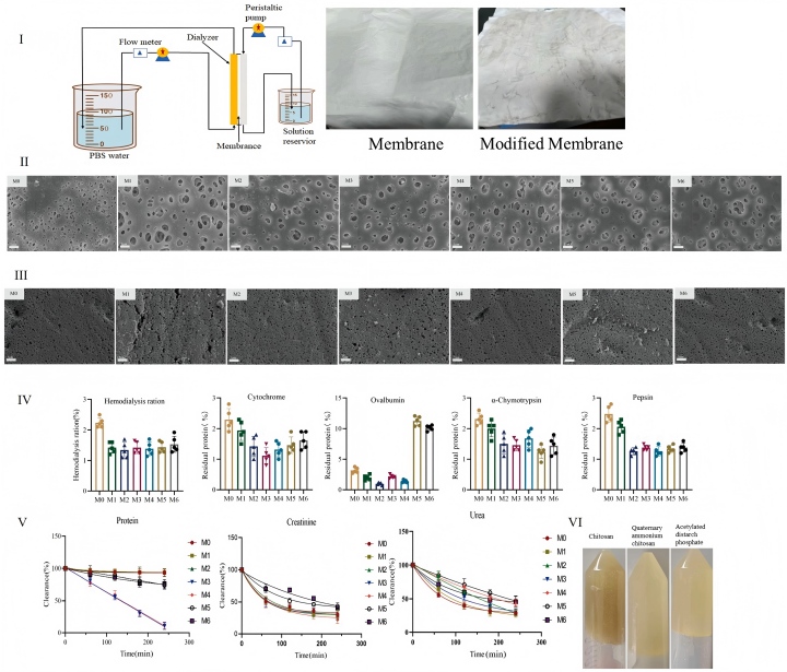 图六、MoS₂-淀粉凝胶在血液透析膜改性中的应用;I单膜透析系统示意图;II改性膜表面形貌;III-V 改性膜透析效果;VI该方法拓展至壳聚糖、乙酰化磷酸酯双淀粉等其他多糖材料的凝胶制备。