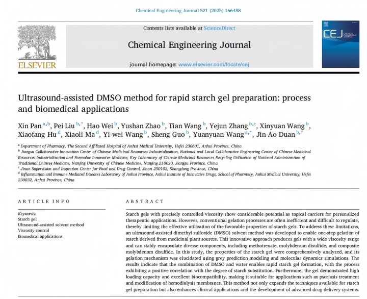 受中药资源循环利用理念启发,团队长期深耕栝楼废弃部位淀粉资源的开发利用,在栝楼淀粉的高值化利用(如纳米淀粉、抗性淀粉复合物等)方面开展了系统研究,相关成果已发表于Food Chemistry (2022)、International Journal of Biological Macromolecules(2022, 2023)等。在此基础上,团队进一步发现,栝楼果瓤淀粉在超声辅助下展现出优异的改性潜质。基于此,近日南京中医药大学段金廒教授、刘培副教授团队在化工领域国际期刊Chemical Engineering Journal上发表题为“Ultrasound-assisted DMSO method for rapid starch gel preparation: process and biomedical applications”的研究论文。该团队利用超声辅助DMSO溶剂法,以中药栝楼废弃果瓤中提取的TKP淀粉为原料,实现了一步法快速制备高粘弹性淀粉凝胶,并系统解析了其形成机制。该策略在银屑病治疗和血液透析膜改性中展现出优异的应用潜力。论文第一作者为潘欣博士(安徽医科大学,南京中医药大学博士);南京中医药大学刘培副教授、段金廒教授为该论文的共同通讯作者。