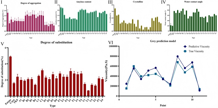 图四、淀粉凝胶粘度调控的关键因素;I-V淀粉凝胶的水接触角、结晶度、直链淀粉含量等指标;VI灰色预测模型建立粘度与关键参数的拟合关系