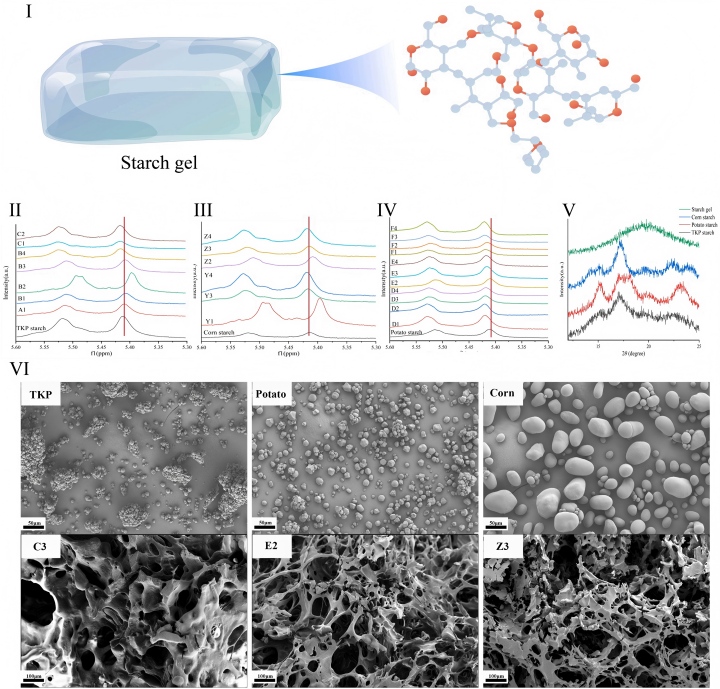 图三、淀粉凝胶的结构与形态表征;I淀粉凝胶性能评价示意图;II-VI凝胶相关性能性质评价指标。