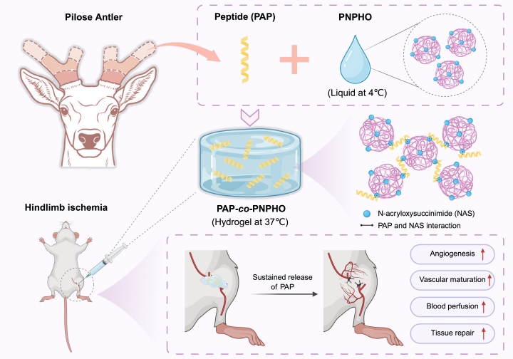该研究成功地将传统中药的智慧与现代生物材料技术相结合,构建了一种集“靶向递送、长效释放、生物活性”于一体的新型水凝胶系统PAP-co-PNPHO。它不仅验证了鹿茸多肽作为促血管生成新分子的潜力,更提供了一种具备临床转化潜力的治疗策略,有望为缺血性疾病的治疗提供一种兼具安全性、有效性和便利性的创新方案。
