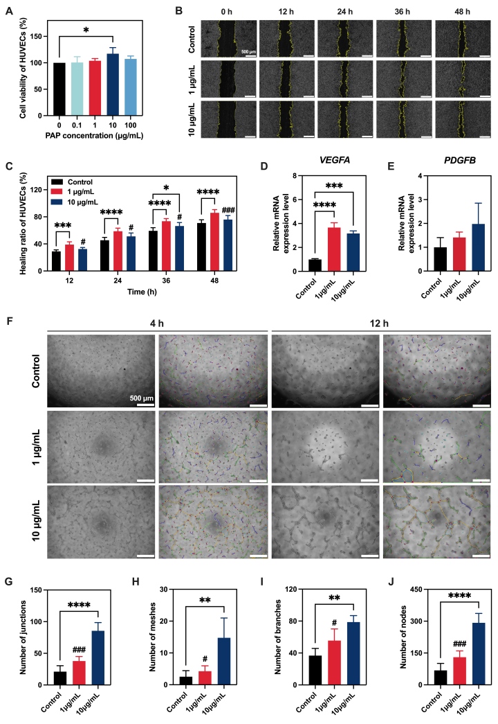 图二、PAP的体外促血管生成活性验证。(A)CCK-8法检测细胞增殖;(B-C)划痕实验检测细胞迁移;(D-E)qRT-PCR检测VEGFA和PDGFB基因表达;(F-J)管状结构形成实验及定量分析。
