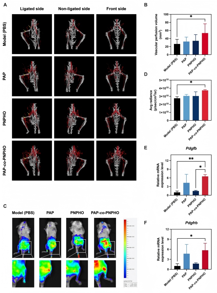 图五、PAP-co-PNPHO促进后肢血管新生与成熟。(A-B)Micro-CT血管重建;(C-D)活体荧光成像;(E-F)PDGF-B/PDGFR-β基因表达。