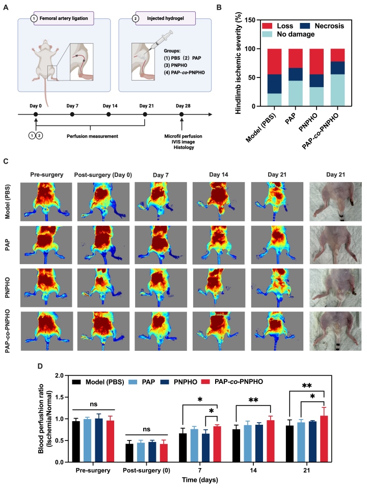 图四、PAP-co-PNPHO在小鼠后肢缺血模型中的疗效。(A)实验设计示意图;(B)术后21天宏观观察;(C-D)激光散斑成像及定量分析。