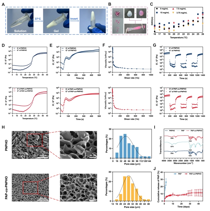 图三、PAP-co-PNPHO水凝胶的性能表征。(A-B)PNPHO水凝胶温敏性和可注射性;(C)PAP与PNPHO最佳耦合浓度的确定;(D-G)流变学分析;(H)SEM微观结构;(I)红外光谱;(J)体外释放曲线。